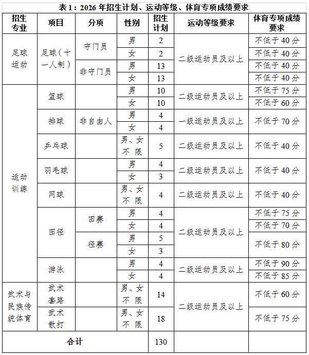 1.体育专项考试满分100分,考试分项目采用全国统考和分区统考方式,由国家体育总局委托院校负责组织实施,执行国家体育总局制定的《普通高等学校运动训练、武术与民族传统体育专业体育专项考试方法与评分标准(2026版)》。
