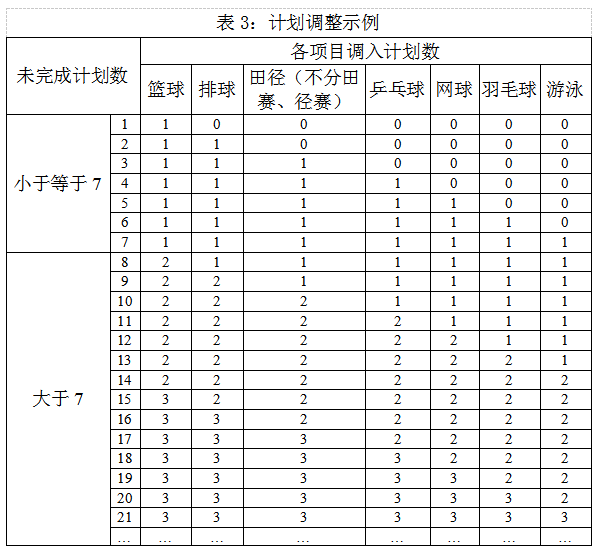 5.经以上优先调整步骤,运动训练专业仍未完成的项目计划,以单个计划数的形式,依次向云南师范大学的招生项目篮球、排球、田径、乒乓球、网球、羽毛球、游泳调整(无生源的项目轮空),不分男女按综合分从高到低进行录取。以此类推,调完为止,计划调整示例见表3。